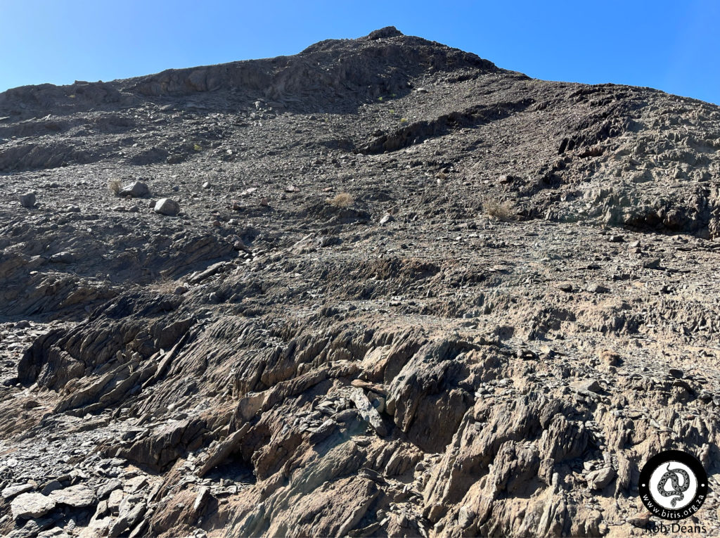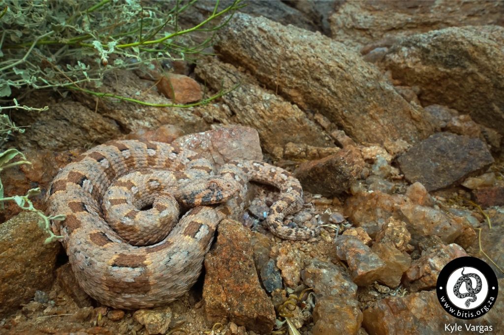 Species history – During a collection trip in 1968 in the south-western corner of Namibia, a hornless Bitis was collected on a rocky hillside near Rosh Pinah Mine. It was decided that a further series of this undescribed form should be collected and compared to the sympatric Bitis caudalis. By 1975, 27 individuals had been collected in southern Namibia and the Northern Cape Province of South Africa. Dr Wulf Haacke, head of herpetology at the Transvaal Museum (now Ditsong Museum), described the species in 1975. Surprisingly, a Bitis collected by Dr P. Range at Kuibis, Namibia and misidentified as Bitis peringueyi by Nieden (1913) is actually the earliest record of Bitis Xeropaga.